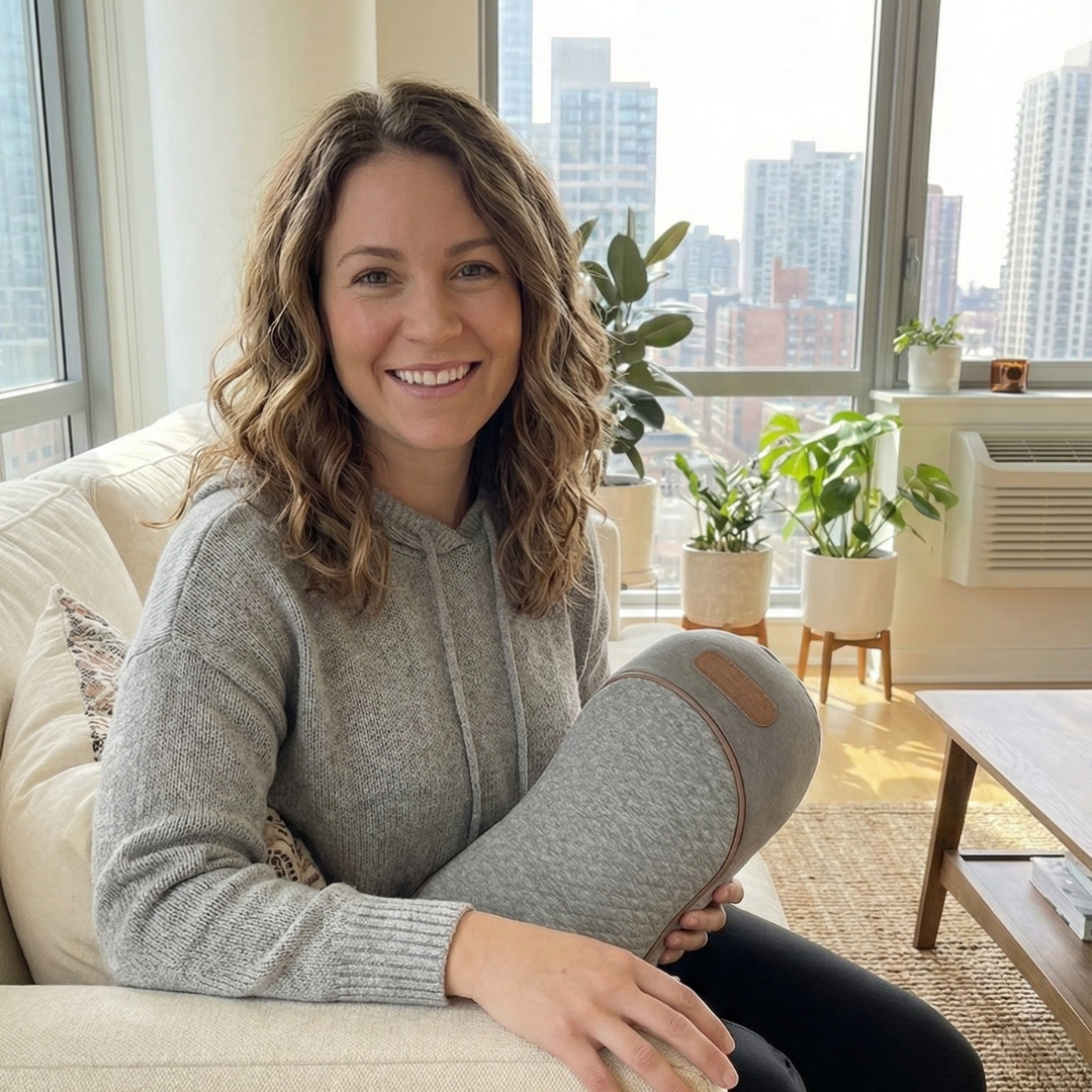 It utilizes in- and deflation, heat, and vibration massage combined with an ergonomic contour memory foam design.